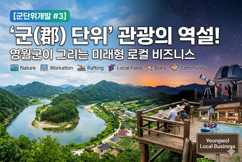 천혜의 자연을 품은 영월군을 모델로, 인구 소멸 위기를 극복하는 '군(郡) 단위' 자원 개발 전략을 분석합니다. 강원도 남부 거점으로서의 역사적 가치와 '단종'이라는 독보적 콘텐츠, 그리고 최근 주목받는 워케이션 인프라까지! 지역 경제의 선순환을 만드는 영월만의 차별화된 관광 생태계와 지속 가능한 발전 모델을 제안합니다.