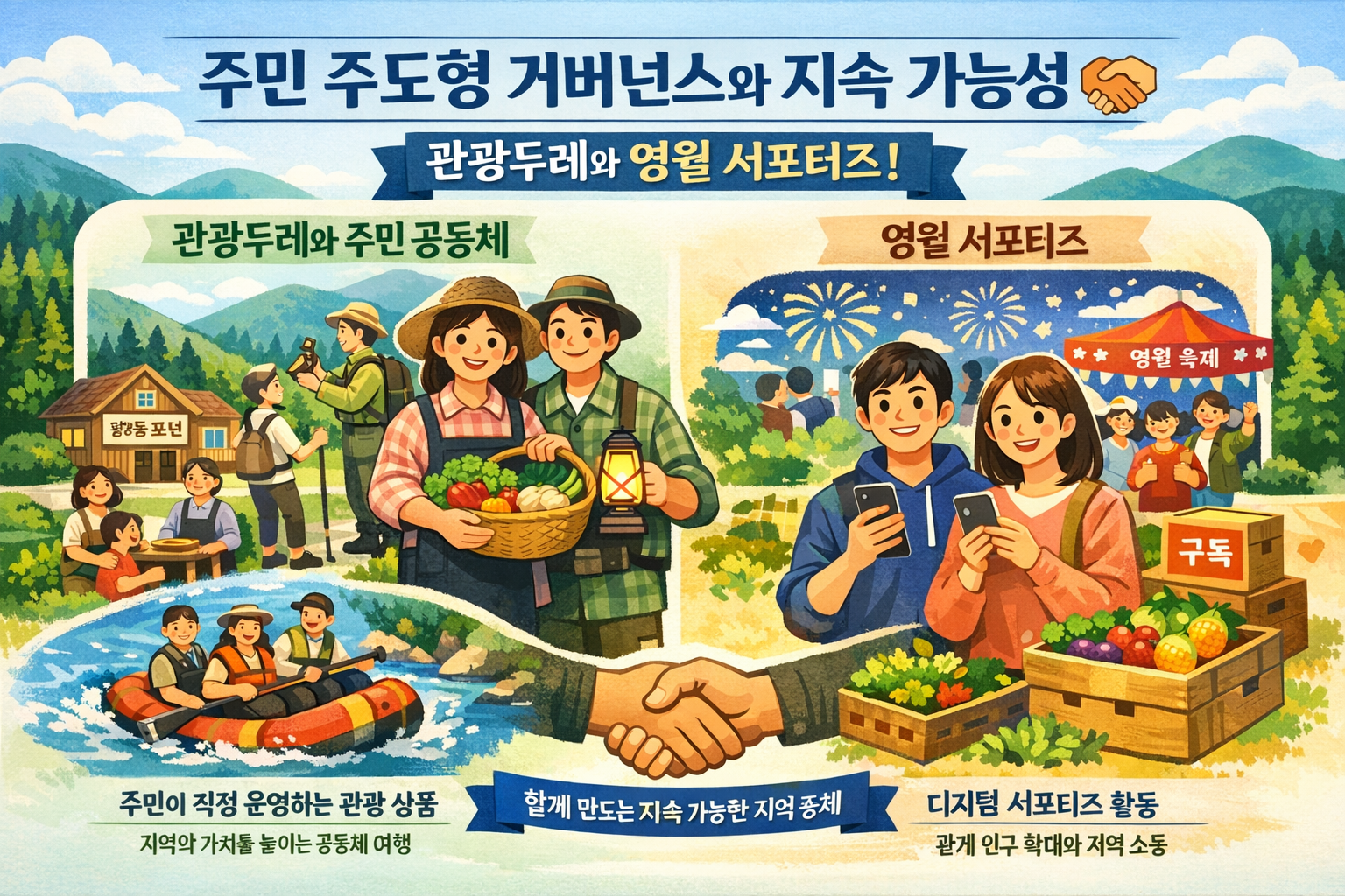 영월은 관계 인구(생활 인구)를 늘리는 데 집중하고 있습니다. 영월에 애정을 가진 외지인들을 '디지털 서포터즈'로 임명하여 정기적인 방문을 유도하고 지역 소식을 전파하게 합니다. 이들은 영월의 농산물을 정기 구독하거나 지역 축제에 적극적으로 참여하며 실질적인 경제 활력을 제공합니다. 영월이라는 공통분모 아래 연결되는 거버넌스는 도시의 외연을 넓히고 새로운 지역 공동체 모델을 제시합니다.