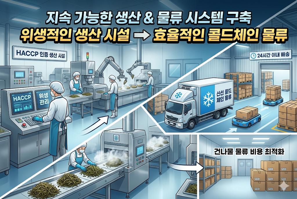 식품 상품화에서 절대 타협할 수 없는 것이 '위생'입니다. 해썹(HACCP) 인증을 받은 자동화 설비를 통해 교차 오염을 방지하고 균일한 품질을 유지해야 합니다. 특히 건나물의 경우 수분 정밀 제어 시스템을 통해 곰팡이 발생을 원천 차단하는 기술이 중요합니다. 깨끗한 시설에서 생산되는 과정은 그 자체로 훌륭한 콘텐츠가 됩니다.