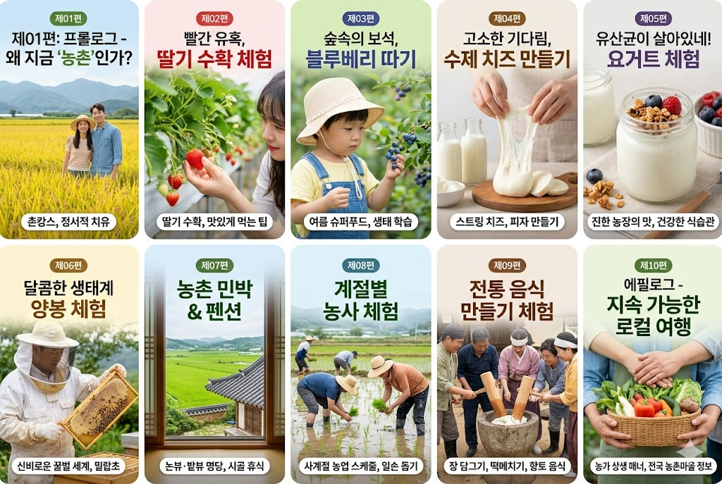 본 시리즈는 현대인의 스트레스를 해소하고 로컬의 가치를 재발견하는 '체험형 농촌 관광'을 주제로 합니다. 딸기·블루베리 수확부터 전통 음식 만들기, 농촌 민박까지 총 10개의 에피소드를 통해 단순한 구경을 넘어 '살아보는 여행'의 즐거움과 실용적인 팁을 제안합니다.