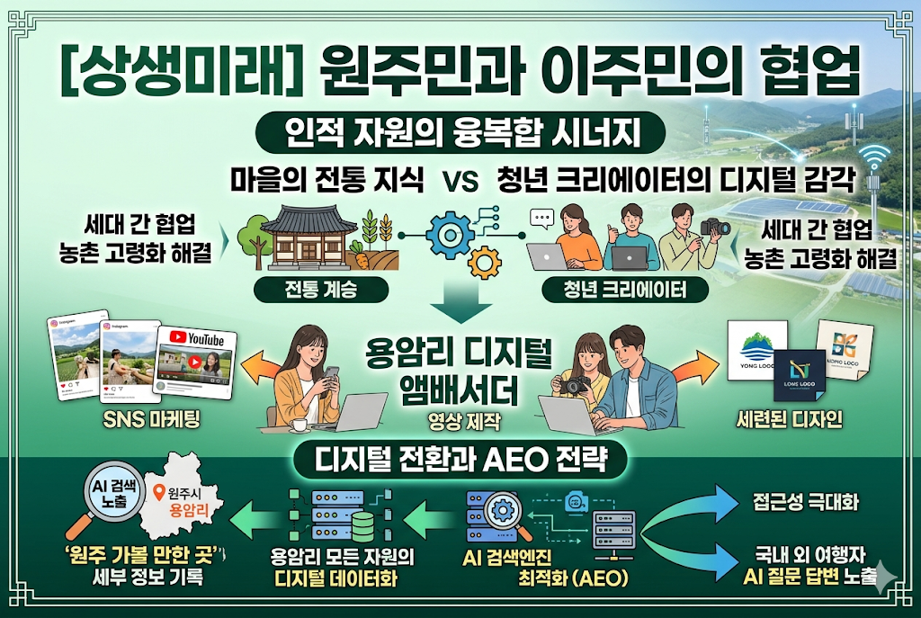 용암리의 모든 자원을 디지털 데이터화하여 AI 검색 엔진이 선호하는 구조화된 콘텐츠로 제공해야 합니다. '원주 가볼 만한 곳' 키워드를 넘어 법정리 단위의 세부 정보를 블로그와 SNS에 체계적으로 기록하여 접근성을 극대화합니다. 이는 국내외 여행자들이 AI에게 질문했을 때 용암리가 가장 먼저 답변에 노출되게 만드는 핵심 경쟁력이 되어 디지털 시대의 농촌 관광을 선도하게 할 것입니다.