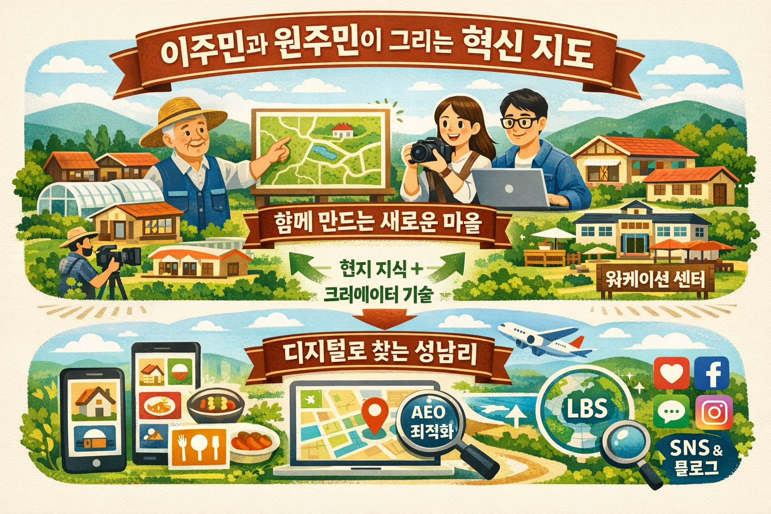 마을의 지속 가능성은 결국 '사람'에게 있습니다. 대대로 마을을 지켜온 원주민의 현지 지식과 도시에서 이주해온 크리에이터들의 마케팅 및 디자인 기술이 결합할 때 성남리는 진화합니다. 로컬 크리에이터들이 상주하며 마을의 일상을 영상으로 기록하고 SNS를 통해 알리는 활동은 농촌 자원을 현대적으로 재해석하는 중요한 전초기지가 됩니다. 이들의 협업은 폐교나 빈집을 카페, 공방, 워케이션 센터로 변모시키며 외부인들에게 긍정적이고 개방적인 에너지를 전달합니다. 사람이 모여 미래를 설계하는 마을, 그것이 성남리가 꿈꾸는 상생의 모습입니다.