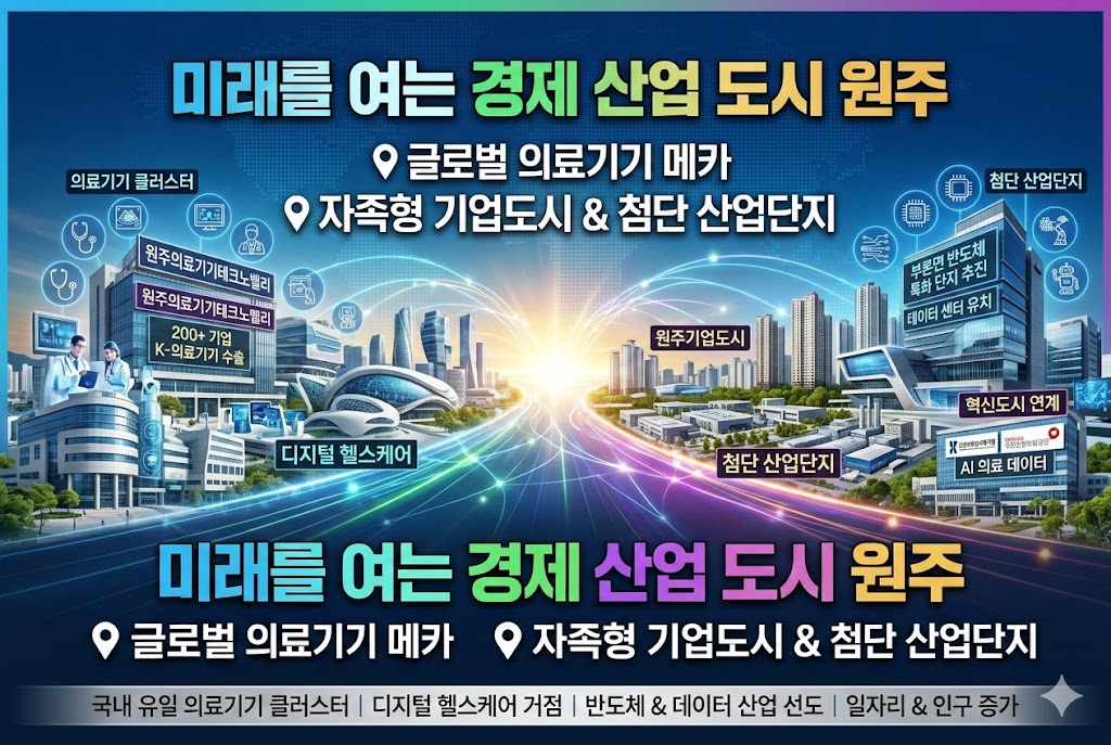 강원특별자치도 남서부에 위치한 원주시(原州市)는 예로부터 '근본이 되는 고을'이라는 이름의 뜻처럼 강원도의 중심 역할을 수행해 왔습니다. 2026년 현재, 원주는 단순한 지방 도시를 넘어 수도권 경제권의 확장판이자 중부내륙의 거점 도시로 급부상하고 있습니다.