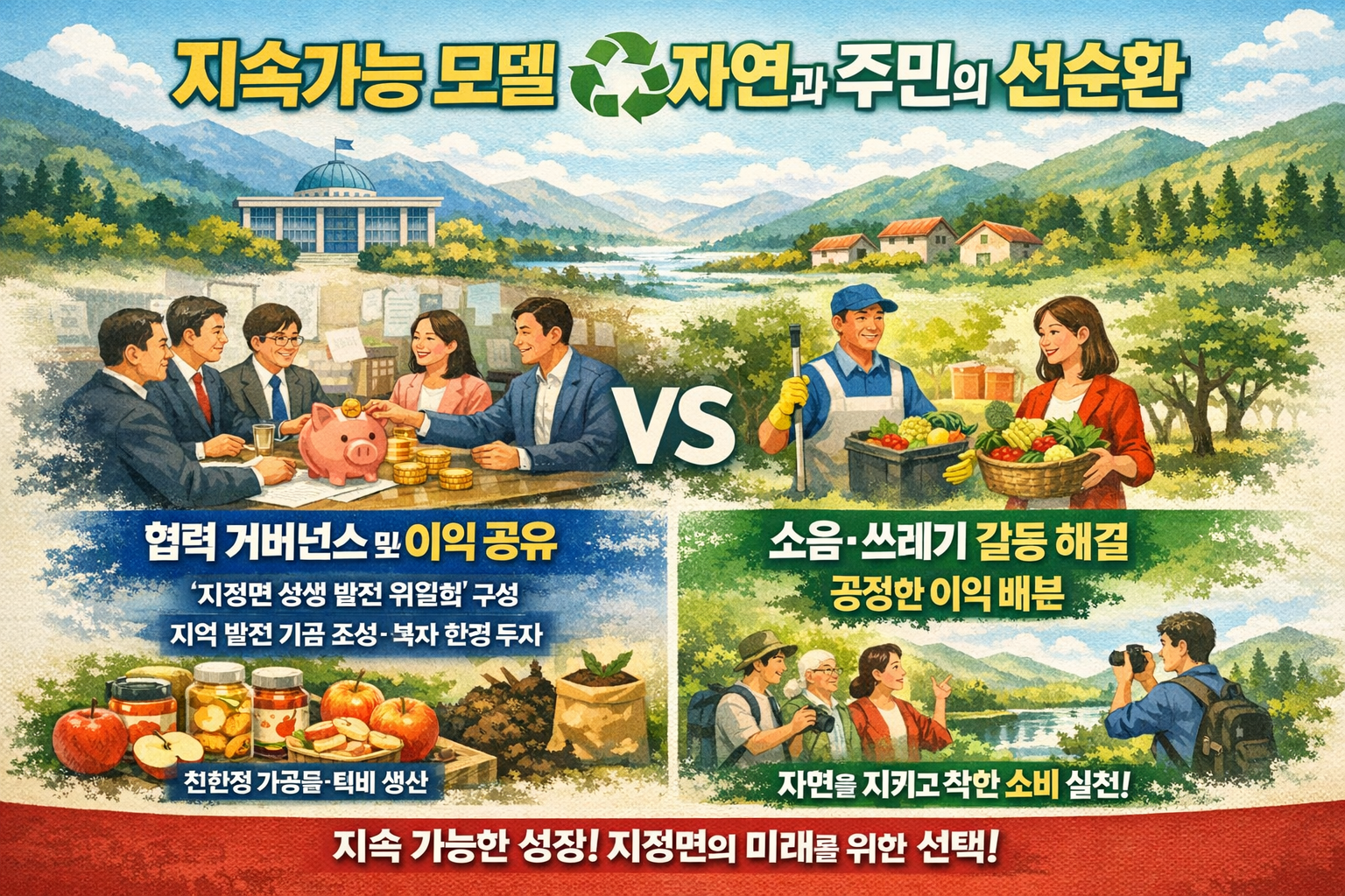 주민이 주체가 될 때 관광은 완성됩니다. 관광 협동조합을 통해 어르신들의 전설 이야기 투어나 주민과 함께하는 산나물 요리 체험 등 삶이 담긴 프로그램을 개발해야 합니다. 이는 관광 수익이 주민에게 직접 돌아가는 선순환 구조를 만들며, 지역 사회의 자긍심을 높이고 외지인과 원주민이 협력하는 상생의 토대를 마련하는 핵심 서비스입니다.5️⃣ [지속가능 모델] 자연과 주민의 선순환 🔄