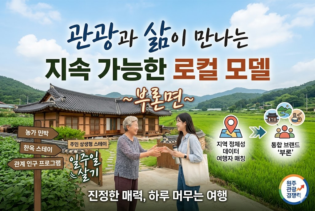 마지막 단계는 부론면만의 독자적인 '브랜드'를 정립하는 것입니다. 행정, 역사, 자연, 예술이 통합된 결과물로서의 브랜드는 인위적인 홍보보다 강력한 힘을 가집니다. 주민 스스로가 마을의 가치를 전파하는 주체가 되어 방문객과 소통할 때, 관광객은 그 진심에 반응하여 충성도 높은 팬이 됩니다. 부론면의 각 법정리가 가진 고유 자원을 데이터화하고 이를 여행자의 요구와 정교하게 매칭시킨다면, 부론면은 전국적인 로컬 브랜드로 거듭날 것이며 이는 곧 원주 전체의 관광 경쟁력을 비약적으로 상승시키는 핵심적인 역할을 수행하게 될 것입니다.